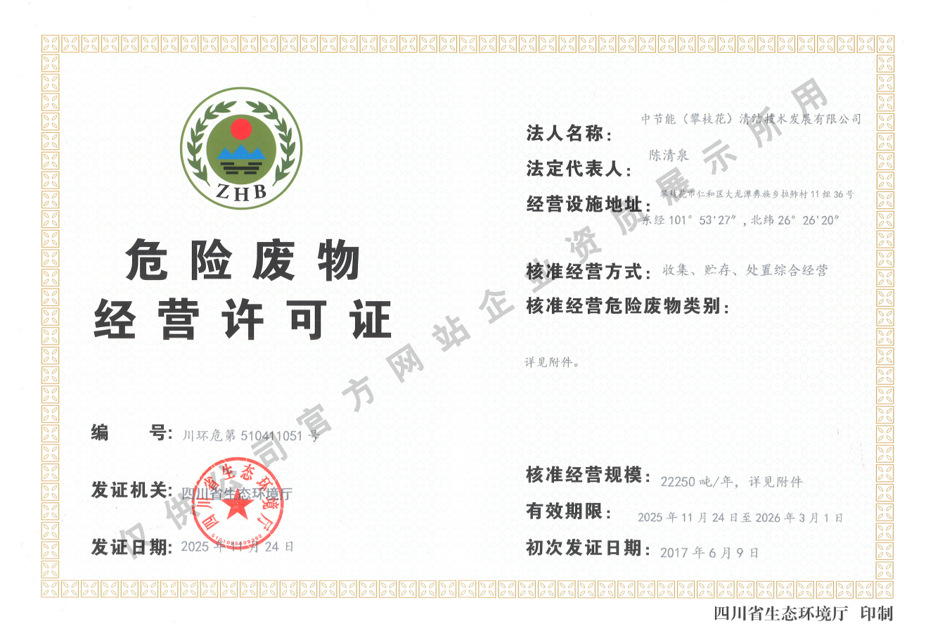 中節(jié)能(攀枝花)清潔技術(shù)發(fā)展有限公司(以下簡(jiǎn)稱(chēng)公司)成立于2008年5月,注冊(cè)資金1.6519億元。公司由中節(jié)能清潔技術(shù)發(fā)展有限公司和攀枝花市產(chǎn)業(yè)投資經(jīng)營(yíng)有限責(zé)任公司共同持股,并由中節(jié)能清潔技術(shù)發(fā)展有限公司控股經(jīng)營(yíng)。公司投資建設(shè)和運(yùn)營(yíng)的攀枝花市危險(xiǎn)廢物處置中心項(xiàng)目是全國(guó)統(tǒng)籌部署的全國(guó)31個(gè)危險(xiǎn)廢物綜合處置中心項(xiàng)目之一,位于攀枝花市仁和區(qū)大龍?zhí)多l(xiāng)迤資村華賣(mài)社,核準(zhǔn)處理原生廢物2.425萬(wàn)噸/年,可對(duì)43大類(lèi),447項(xiàng)(醫(yī)療廢物)進(jìn)行安全處置。